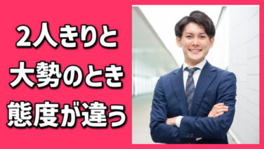 付き合う前の男性心理 2人きりと大勢のときで態度が違う男性の心理8選!脈ありか聞いてみた 2人きりと大勢のときで態度が違う男性っていますよね。今回は2人きりと大勢のときで態度が違う男性の心理について、男性30名に聞いたアンケート結果を紹介します。2人きりと大勢のときで態度が違う男性は、脈ありなのでしょうか? 2022.09.08 付き合う前の男性心理